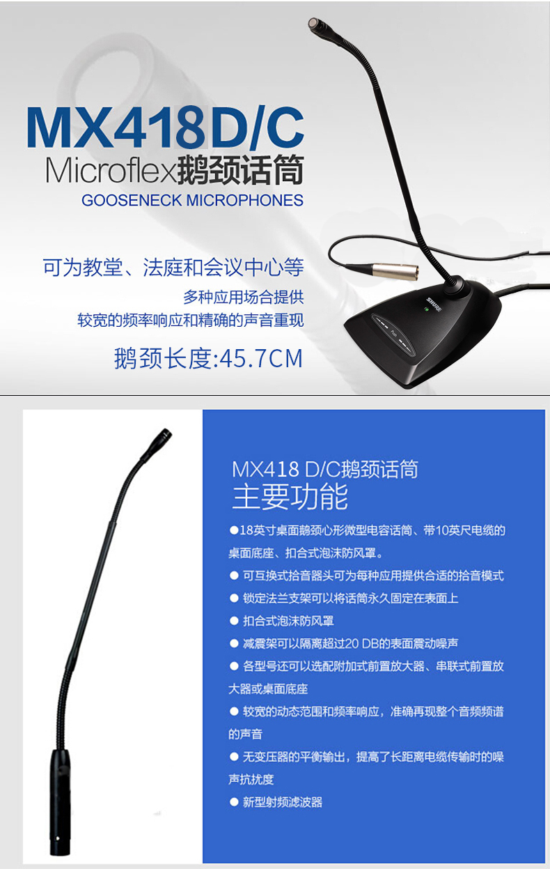 SHURE 舒爾(Shure)MX418D/C會議話筒桌面臺式有線鵝頸演講教堂超心形電容麥
