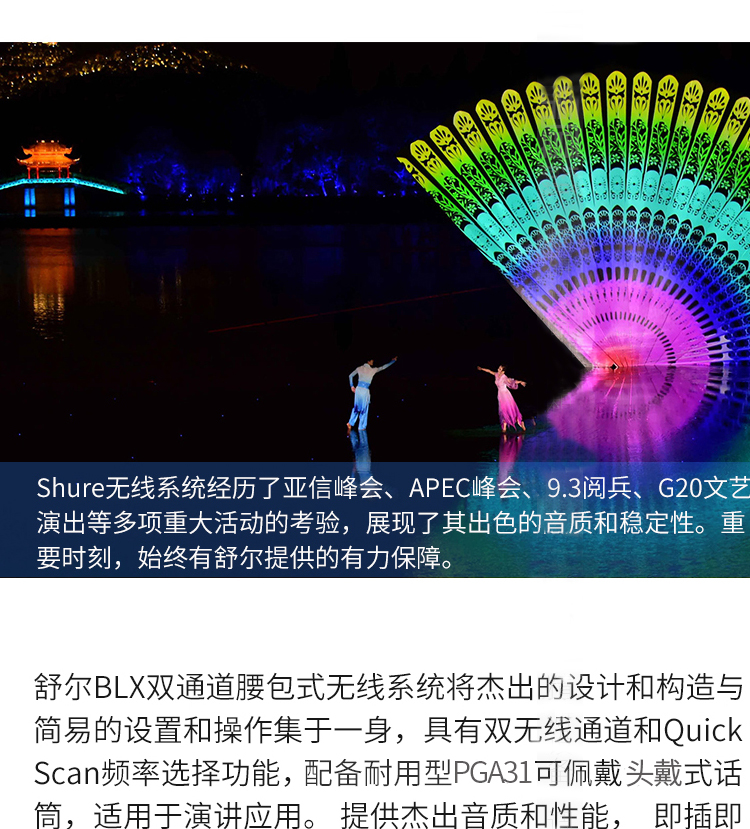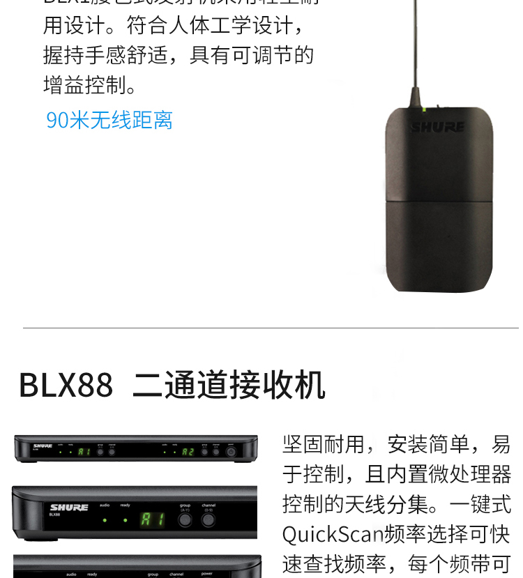 舒爾BLX無線系統不僅能夠提供專業品質的音效,并且安裝簡易,界面直觀,即插即用,品質優異。其設計精密,有手持式、領夾式、樂器和頭戴式等多種配置可選,是舞臺上的絕佳之選。BLX標準版配備帶PG話筒頭的單通道和雙通道系統。